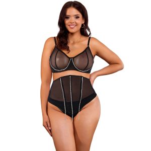Braga Negra Sexy de Encaje Transparente con Cinturón de Liga Talla