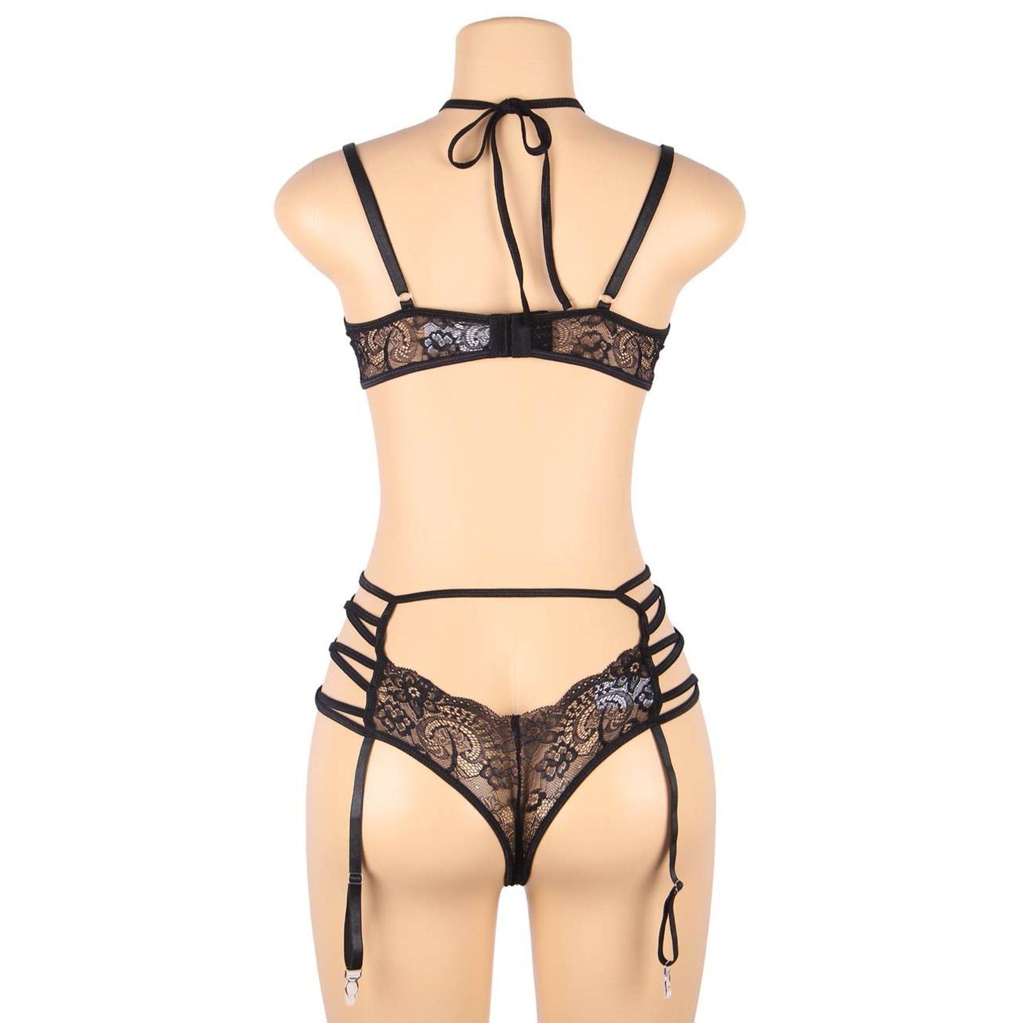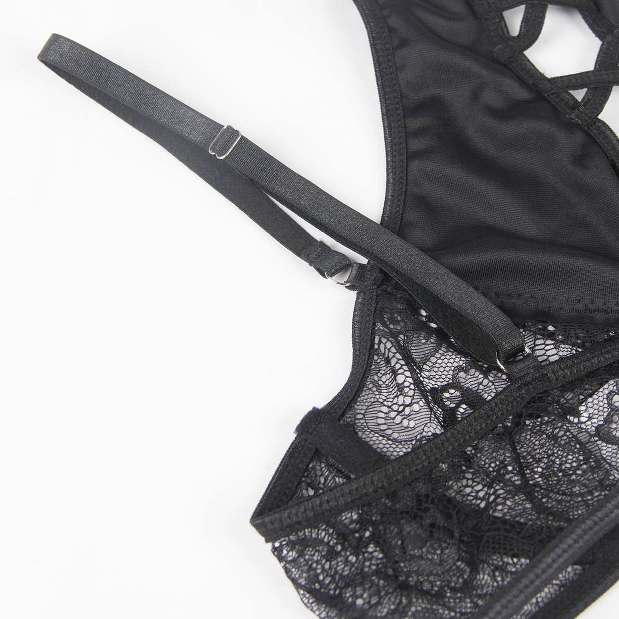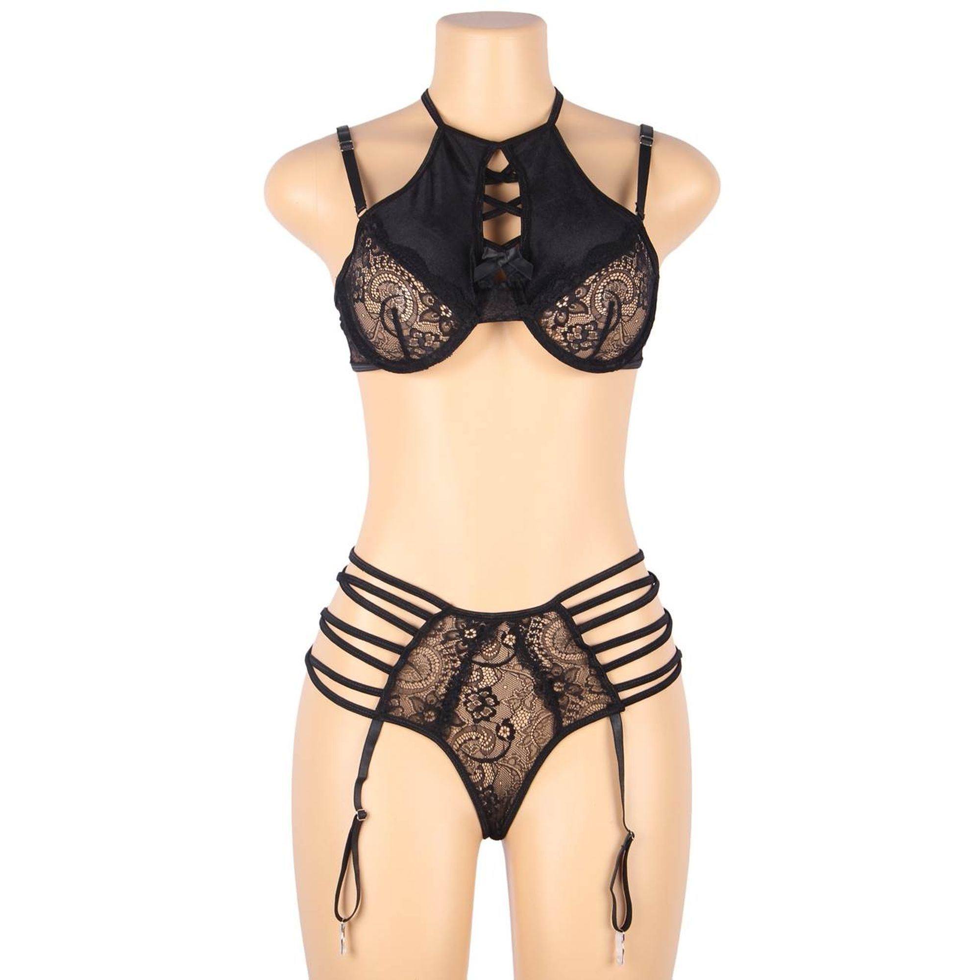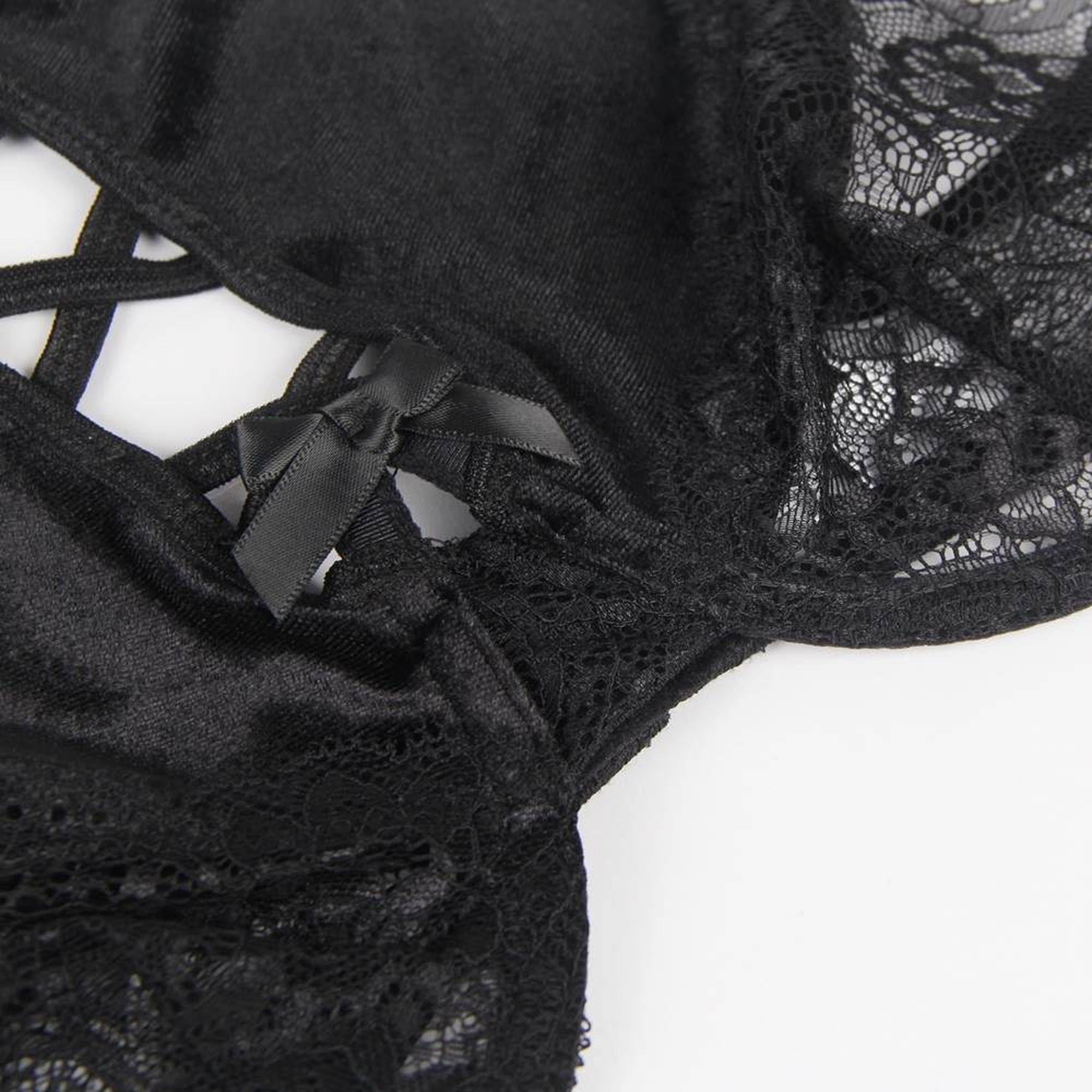 Conjunto de lencería negro de terciopelo y encaje con liga
